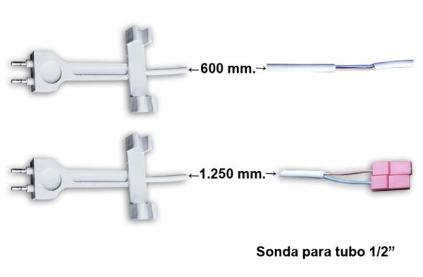 Elemento sensible que está formado por un cable de 1250 mm o de 600 mm.. Redondo de 1/2” 0,50 de doble aislamiento con terminación en tetones de acero inoxidable AISI 304 con una separación entre puntas de 9 mm. E inyectada con poliestireno antichoque. Los terminales de conexión son faxton hembra de 6,3 mm. aislados. La sonda de 600 mm. De largo se suministra sin terminales.